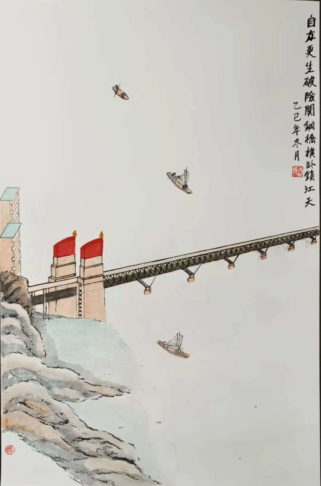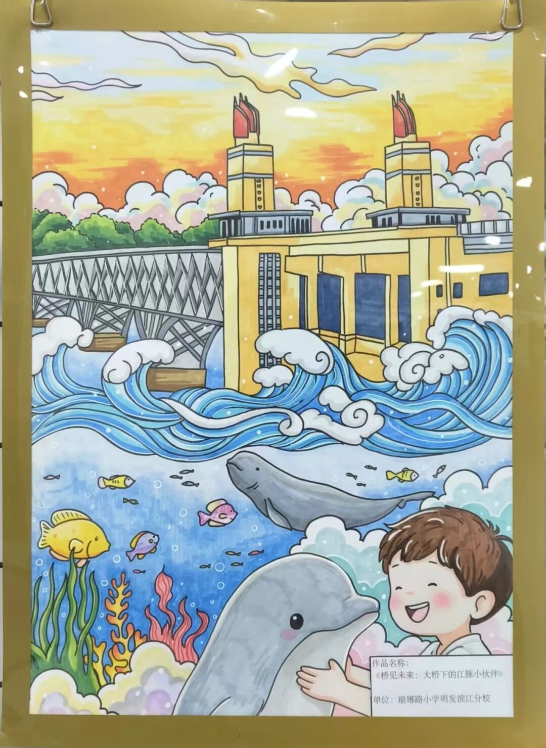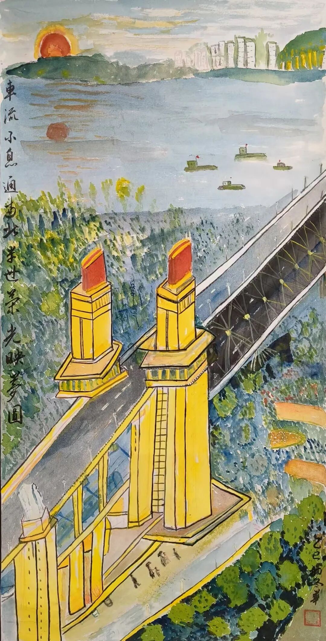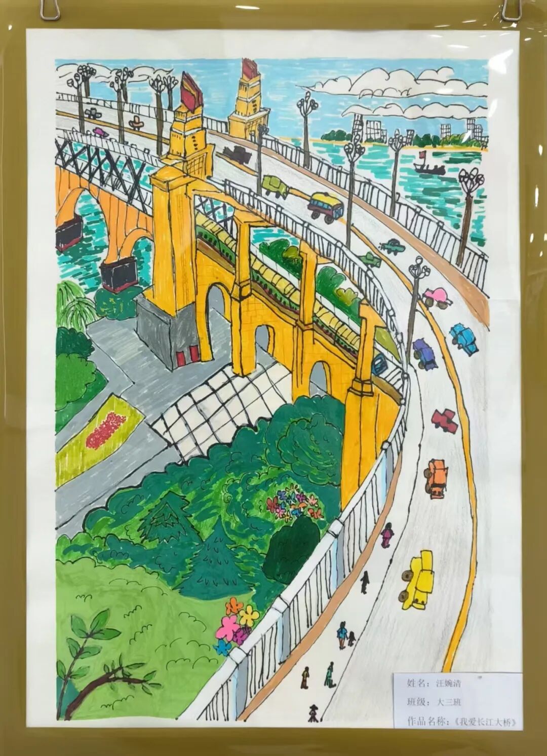 展陈见真情,文化润人心。展览现场不仅有宏大的历史叙事,更有充满温度的全民创作展区,四组特色作品让大桥精神以更鲜活的方式触达人心。琅小明发滨江分校、津浦幼儿园的孩子们用烂漫色彩绘制长江大桥,将童真向往融入画笔;该校“桥梁兴趣班”的学生则巧手搭建大桥模型,在结构与材质的探索中践行学思践悟的探索精神;“守望江桥 定格幸福”摄影展收录了泰山街道居民的作品,既记录大桥四季流转的风景,也留存了人与桥相伴的温暖日常;泰山书法队的书画作品墨韵抒怀,其中 90 岁长者创作的大桥水墨画,更将几代人的集体记忆与家国情怀浓缩于笔墨之间。