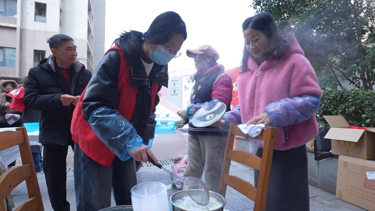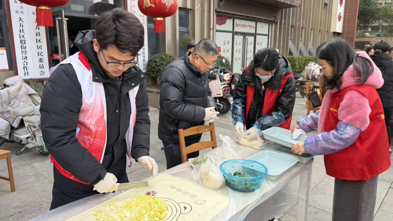 舞台之下,便民互动暖心暖胃。社区精心设置的三大特色摊位前人头攒动,成为活动现场的“人气打卡点”。写春联摊位上,红宣纸整齐铺开,笔墨飘香四溢,志愿者们挥毫泼墨,将一幅幅寓意吉祥的春联和“福”字送到居民手中,刚写好的春联还带着墨香,就被大家满心欢喜地收入囊中;包饺子摊位前,居民们围坐在一起,揉面、放馅、捏褶,动作娴熟又默契,一个个饱满圆润的饺子逐渐成型,不仅包裹着鲜香的馅料,更承载着邻里间的情谊;义剪摊位前,专业理发师耐心细致地为居民修剪头发,清爽利落的发型深受大家的欢迎,“在家门口就能免费理发,社区的活动太贴心了!”刚剪完头发的张阿姨满意地说。