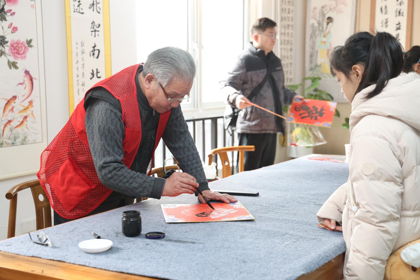走进活动现场,手工区里纸墨清香萦绕,成为居民们与传统年俗对话的温馨角落。书法志愿者挥毫送福,居民们或提笔体验、或拓印福字、或编织万字结门挂,在指尖的匠心巧思里,将平安吉祥的新春期许,揉进每一件亲手制作的作品中,非遗技艺也在沉浸式体验中变得可触可感。