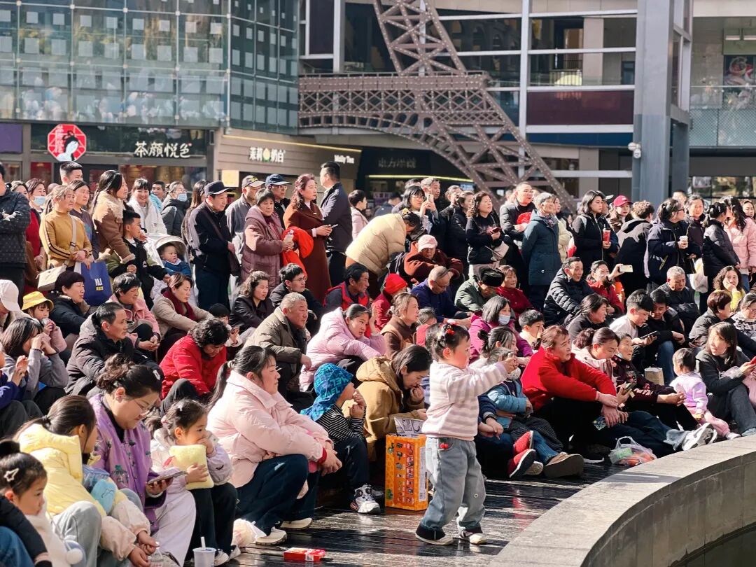 表演开场,桥北商圈内人头攒动,热闹非凡。随着一阵激昂的鼓点声响起,活动在气势恢宏的民俗舞《张灯结彩过大年》中正式拉开帷幕。只见金色的狮子翻腾起舞,演员们手持红绸与灯笼,踏着欢快的节奏,瞬间将现场氛围推向高潮。过往的市民纷纷驻足,拿出手机记录下这精彩的一幕。“本来只是来商圈逛逛买点东西,没想到还能看到这么专业、这么热闹的演出,感觉年味一下子更浓了!”抱着孩子的市民李女士兴奋地说道。