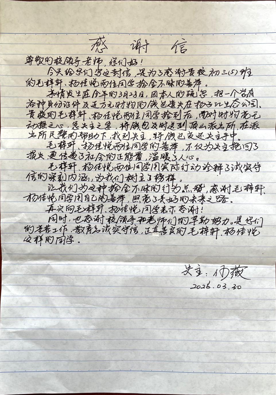 信中,何女士再次向毛梓轩、杨佳悦两位同学郑重致谢,同时也向校领导与老师们表达了感谢。她表示,正是老师们的辛勤工作与悉心教育,才培养出了诚实守信、正直善良的学生。