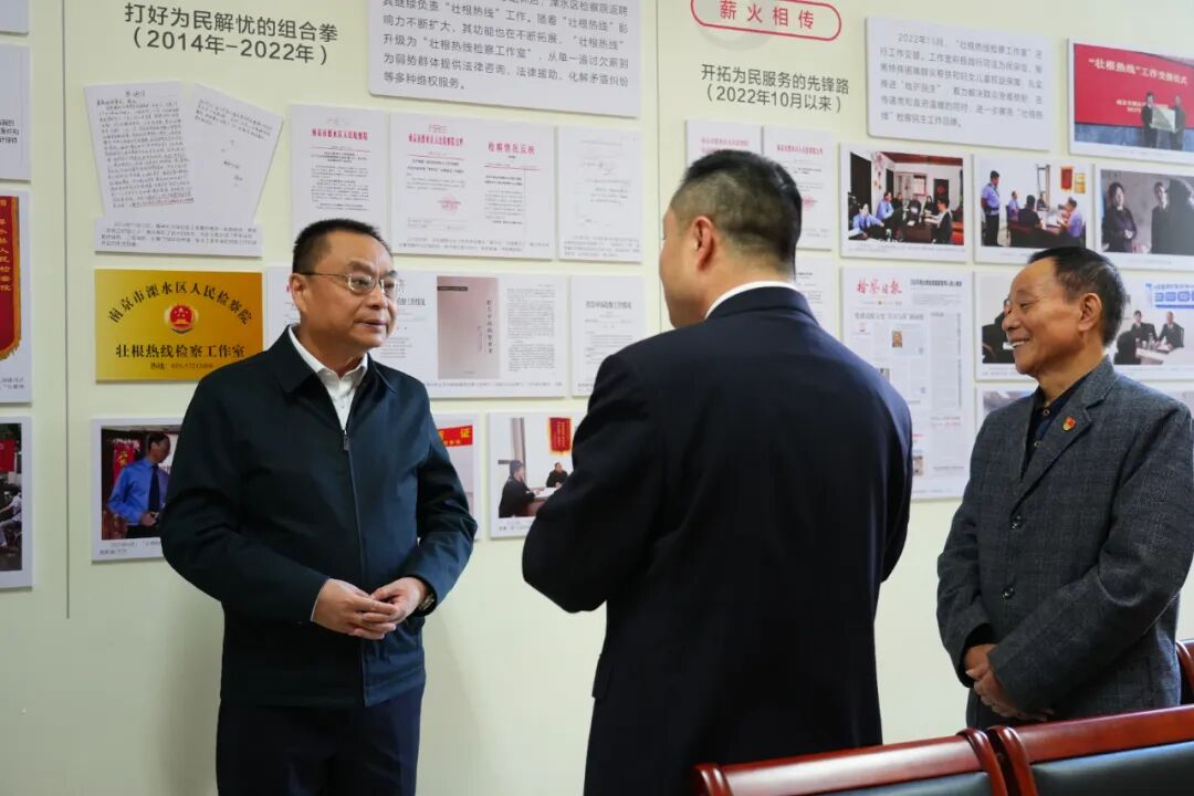 在溧水区检察院,赵铁实首先走进12309检察服务中心,调研“壮根热线检察工作室”,对该院立足职能做好涉检群众工作,用心搭建检民“连心桥”的做法予以肯定。他指出,信访是送上门来的群众工作,检察机关必须牢牢站稳人民立场,坚持和发展新时代“枫桥经验”,持续深化打造“壮根热线”工作品牌,更好发挥这一品牌在塑造精神、凝聚力量、树立形象、推动工作方面的作用,扎实推进信访矛盾源头治理和积案化解。要积极参与综治中心规范化建设,用心用情解决好群众涉法涉诉急难愁盼。