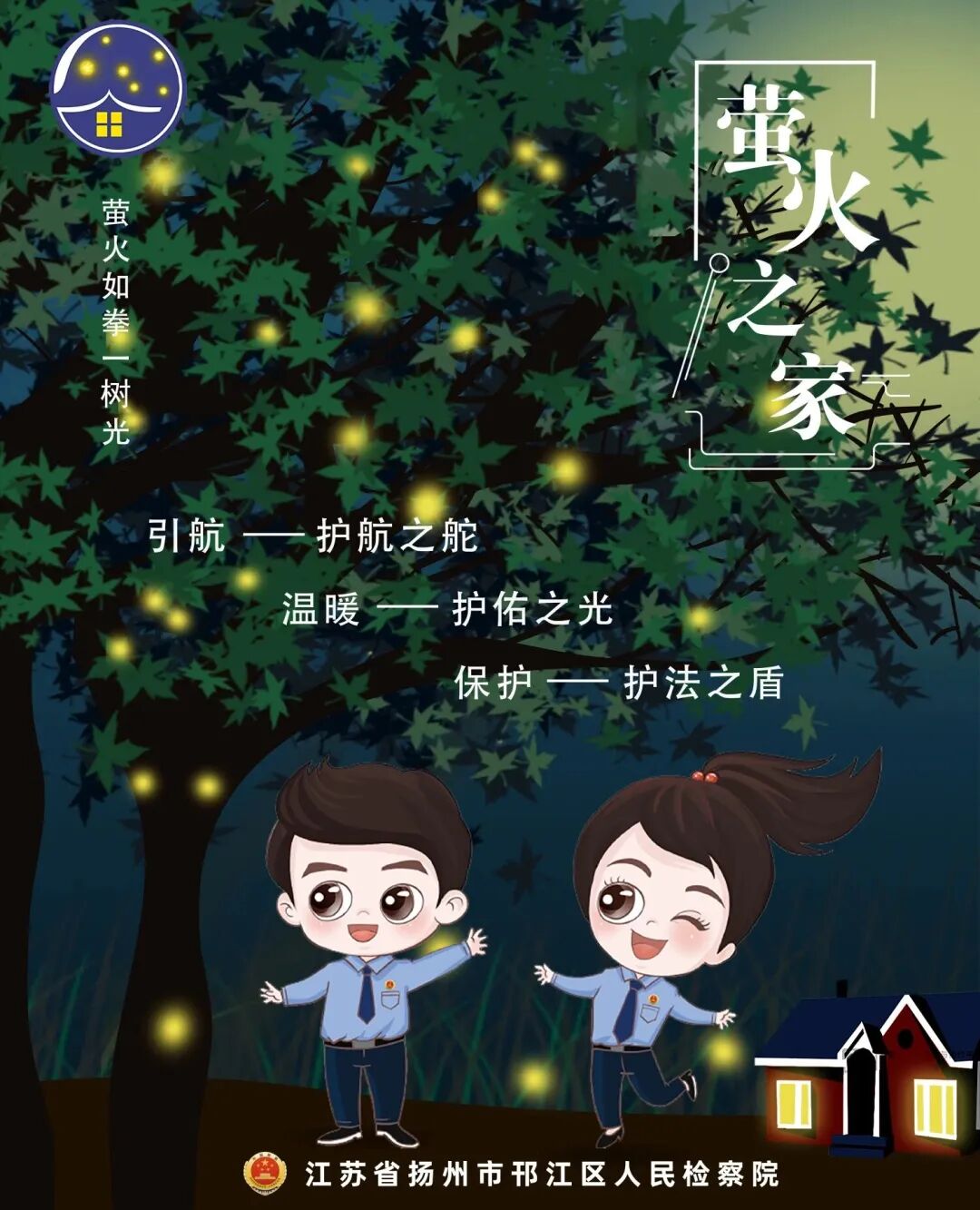 品牌内涵:“萤火如拳一树光”的诗句哲思,在江苏省扬州市邗江区人民检察院检察人员心中升华为“引航、温暖、保护”的担当,他们融合“邗江”地名与萤火意象打造未检品牌,以萤火微光聚炬护童。品牌以文化IP为翼,创制“邗萤萤、江火火”普法IP,通过衍生文创和法治作品向少年播撒法治火种;以数字技术为帆,自主研发“数字未检”平台形成全链条保护体系,成为省域蓝本且效能辐射多省;以无障普法为桥,建成全国首个无障碍青少年法治教育基地,感召干警化身“萤火志愿者”,践行“有爱无‘碍’”理念守护每个孩子。