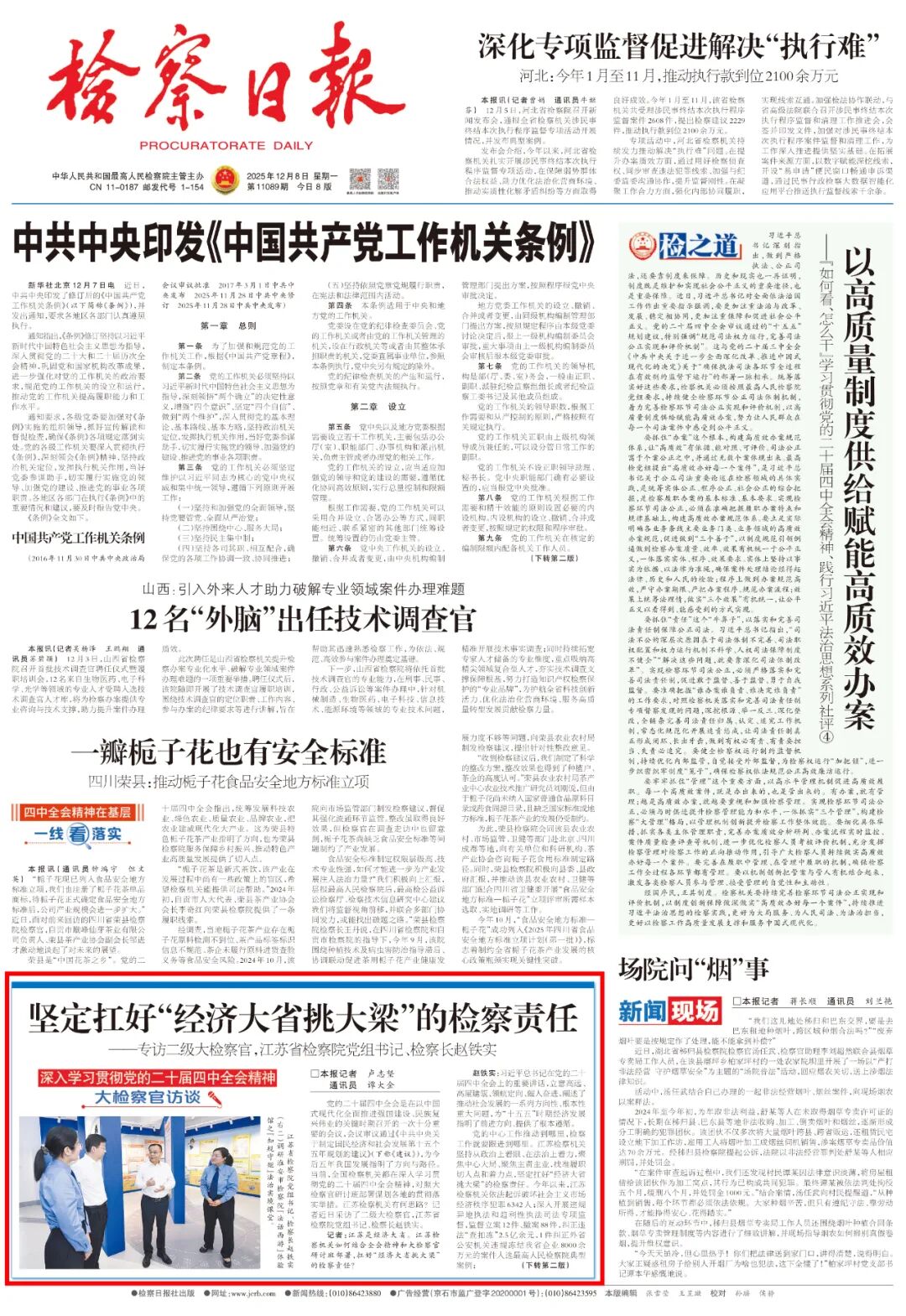 赵铁实:江苏检察机关坚持把加强自身建设摆在突出位置,以更高标准、更实举措一体推进政治、业务、作风、基层基础建设,不断夯实检察工作长远发展根基。以更强定力抓好政治建设,把始终坚持党对检察工作的绝对领导作为最高原则和最大优势,完善习近平总书记重要指示批示和党中央重大决策部署在检察机关落实机制,确保上下贯通、执行有力;持续强化理论武装,常态化开展习近平法治思想的学习宣传培训,做到学思用贯通、知信行统一。