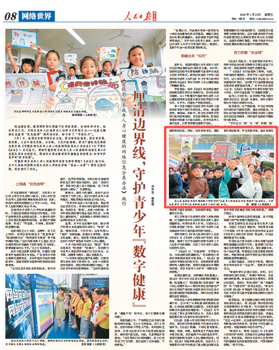 4月24日,《人民日报》(海外版)刊发《厘清边界线,守护青少年“数字健康”》一文,文中配图聚焦淮安市洪泽区检察院的特色普法实践——由该院联合区委网信办、团区委,共同走进淮安市洪泽湖实验小学,开展“法话西游”普法进校园的现场实况。