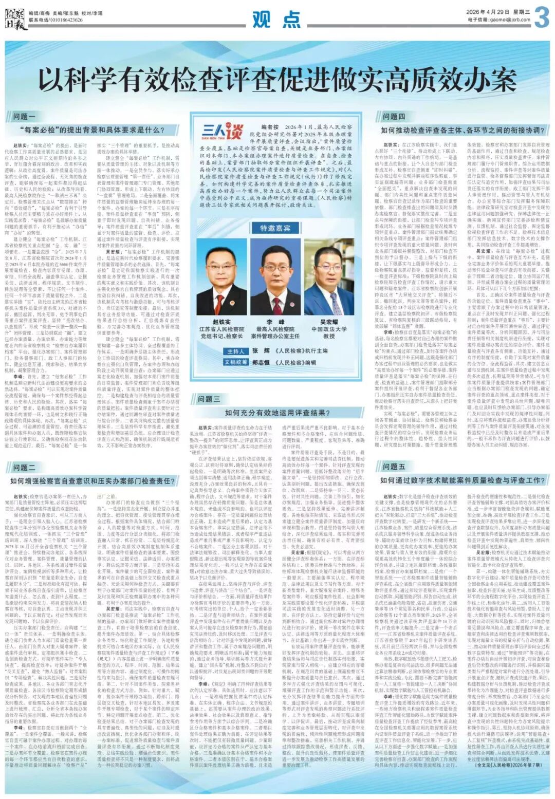 赵铁实:“每案必检”的提出,是新时代检察工作高质量发展的必然要求,是回应人民群众对公平正义新期待的务实之举,背后蕴含着深刻的政治、改革和实践逻辑:从政治高度看,案件质量是司法办案的生命线,通过全流程、无死角的检查评查,能够确保每一起案件都经得起法律、历史和人民的检验;从改革导向看,最高人民检察院作出“一取消三不再”决定后,检察管理关注点从“数据排名”转向“质效提升”,“每案必检”有利于引导检察人员把主要精力放在办好案件上;从实践需求看,“每案必检”是破解办案质量问题的重要抓手,有利于推动从“办结”向“办好”的转型。