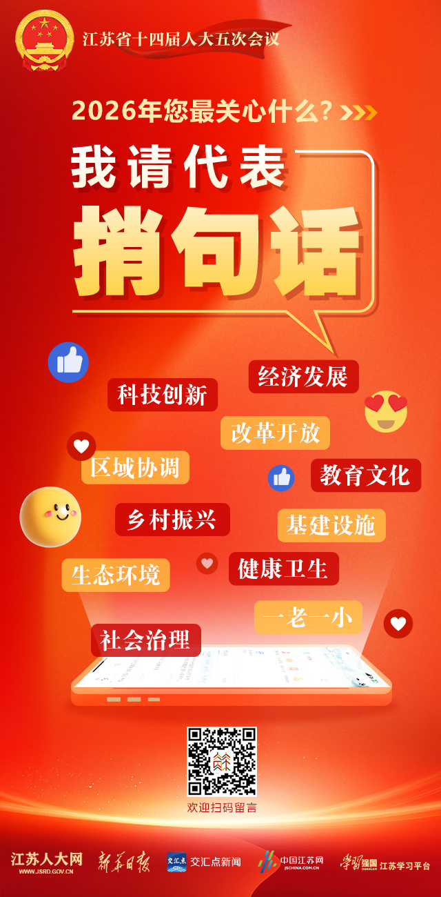 回顾过去,您在工作生活中有哪些观察与体会?站在新的一年,您有哪些盼望和期待?“我请代表捎句话”建言征集活动将持续至今年一月底。本次征集活动涵盖了“科技创新”“经济发展”“区域协调”“改革开放”“乡村振兴”“教育文化”“健康卫生”“生态环境”“基建设施”“社会治理”“一老一小”等多个话题。诚挚邀请您围绕江苏经济社会发展的方方面面,继续提出宝贵意见和建议,您的真知灼见将有机会被带上省人代会。