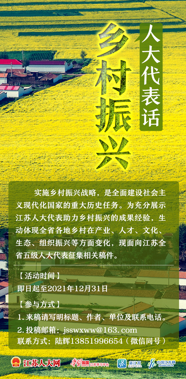 编者按:为全景展示江苏省各级人大代表履职尽责的风采情怀,充分反映人大代表助力乡村振兴的成果经验,由江苏省人大常委会办公厅宣传处、新江苏客户端、中国江苏网联合举办,“学习强国”江苏学习平台特别支持的“人大代表话乡村振兴”重点策划,面向江苏全省五级人大代表征集相关履职稿件并择优推出。今日推出第九篇,敬请关注!