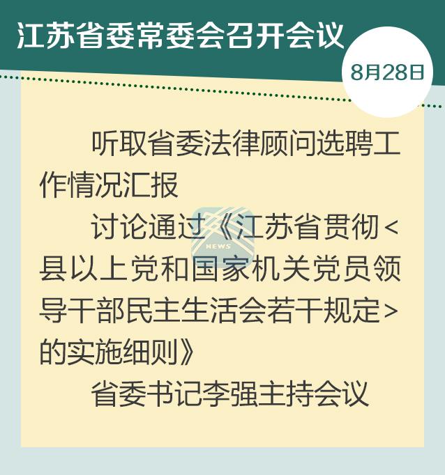 交汇点讯 8月28日,省委常委会召开会议,听取省委法律顾问选聘工作情况汇报,讨论通过《江苏省贯彻<县以上党和国家机关党员领导干部民主生活会若干规定>的实施细则》。省委书记李强主持会议。