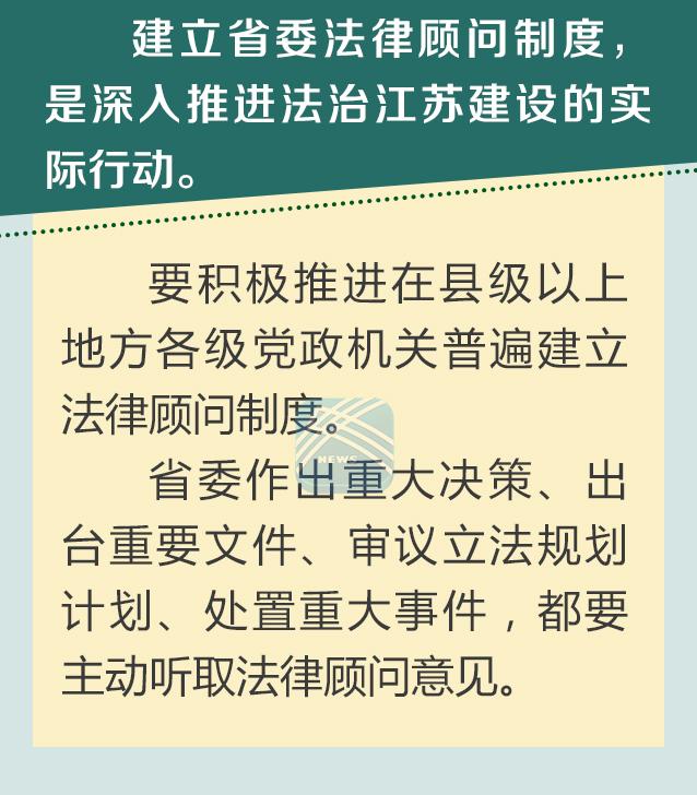 会议指出,建立省委法律顾问制度,是落实党的十八届三中全会关于普遍建立法律顾问制度的要求、深入推进法治江苏建设的实际行动。