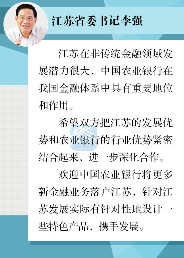李强感谢中国农业银行长期以来对江苏经济社会发展的大力支持。他说,江苏制造业基础厚实,科教人才资源丰富,传统金融业基础较好,在非传统金融领域发展潜力很大。中国农业银行横跨城乡两个市场,网络渠道优势明显,在我国金融体系中具有重要地位和作用。推进我省经济转型升级,离不开金融的有效支撑,希望双方以此次战略合作为新的起点,在创新金融支持实体经济方式上加强合作,把江苏的发展优势和农业银行的行业优势紧密结合起来,进一步深化合作。