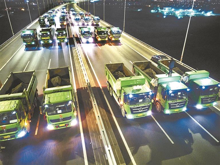 图为40辆重型卡车在苏通大桥上进行荷载试验。