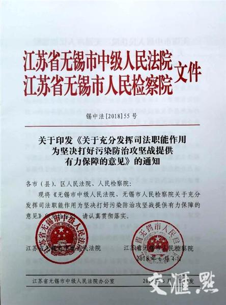 中国江苏网讯 6月5日,无锡市中级人民法院与无锡市检察院联合召开新闻发布会,向社会公布两家共同出台的《关于充分发挥司法职能作用,为打好污染防治攻坚战提供有力保障的意见》(下称《意见》)。《意见》在治水、治固废、治“散乱污”企业、治气、治土壤等“五治”上,用最严格制度最严密法治向污染环境亮剑。