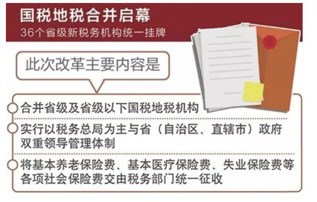 2018年3月,中共中央印发了《深化党和国家机构改革方案》(以下简称《方案》)。其中,第四十六条明确:要改革国税地税征管体制。改革的主要内容是合并省级及省级以下国税地税机构,实行以国家税务总局为主与省(自治区、直辖市)政府双重领导管理体制,将基本养老保险费、基本医疗保险费、失业保险费等各项社会保险费交由税务部门统一征收。