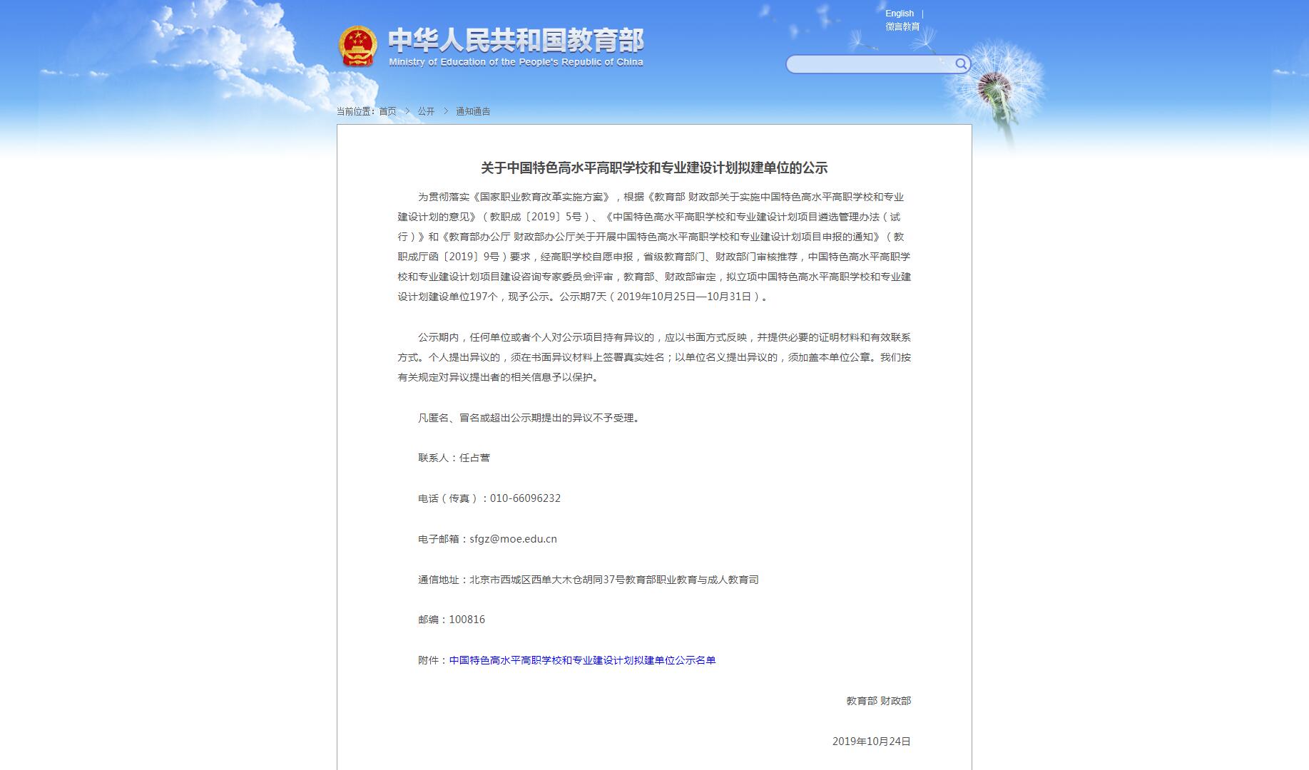 10月25日,教育部和财政部正式发布《关于中国特色高水平高职学校和专业建设计划拟建单位的公示》,拟立项中国特色高水平高职学校和专业建设计划建设单位197个。
