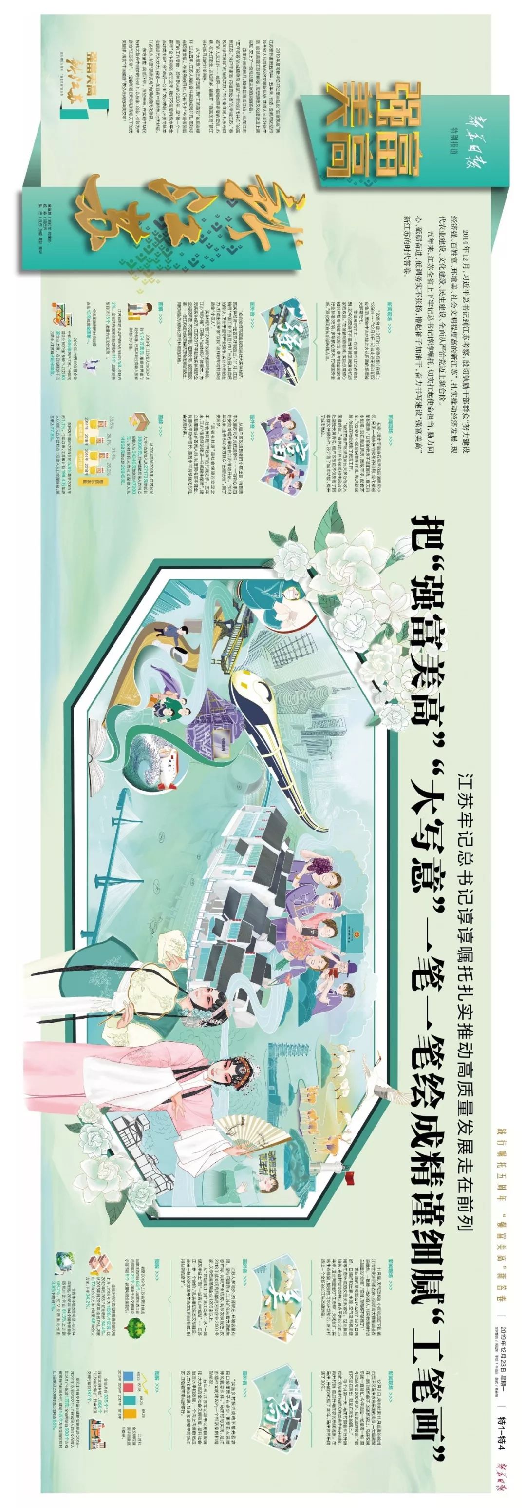 连日来,新华报业传媒集团“报网端微”全媒体矩阵全方位出击,多乐种多声部齐奏“强富美高”五年答卷雄浑交响。今天,《新华日报》浓墨重彩推出八联版“压轴”钜献,聚焦江淮大地沧桑巨变,礼赞江苏人民伟大实践,铺展“强富美高”新江苏物换星移、日新月异的壮美画卷。