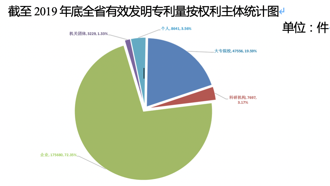 发明专利拥有量成绩显著,截至2019年底,全省发明专利拥有量242803件,万人发明专利拥有量30.16件,同比增加3.71件,居全国省际第一。根据有效发明专利量的权利主体统计,企业占全省发明专利拥有量的72.35%,大专院校占19.59%,科研机构占3.17%,个人占3.56%,机关团体占1.33%。