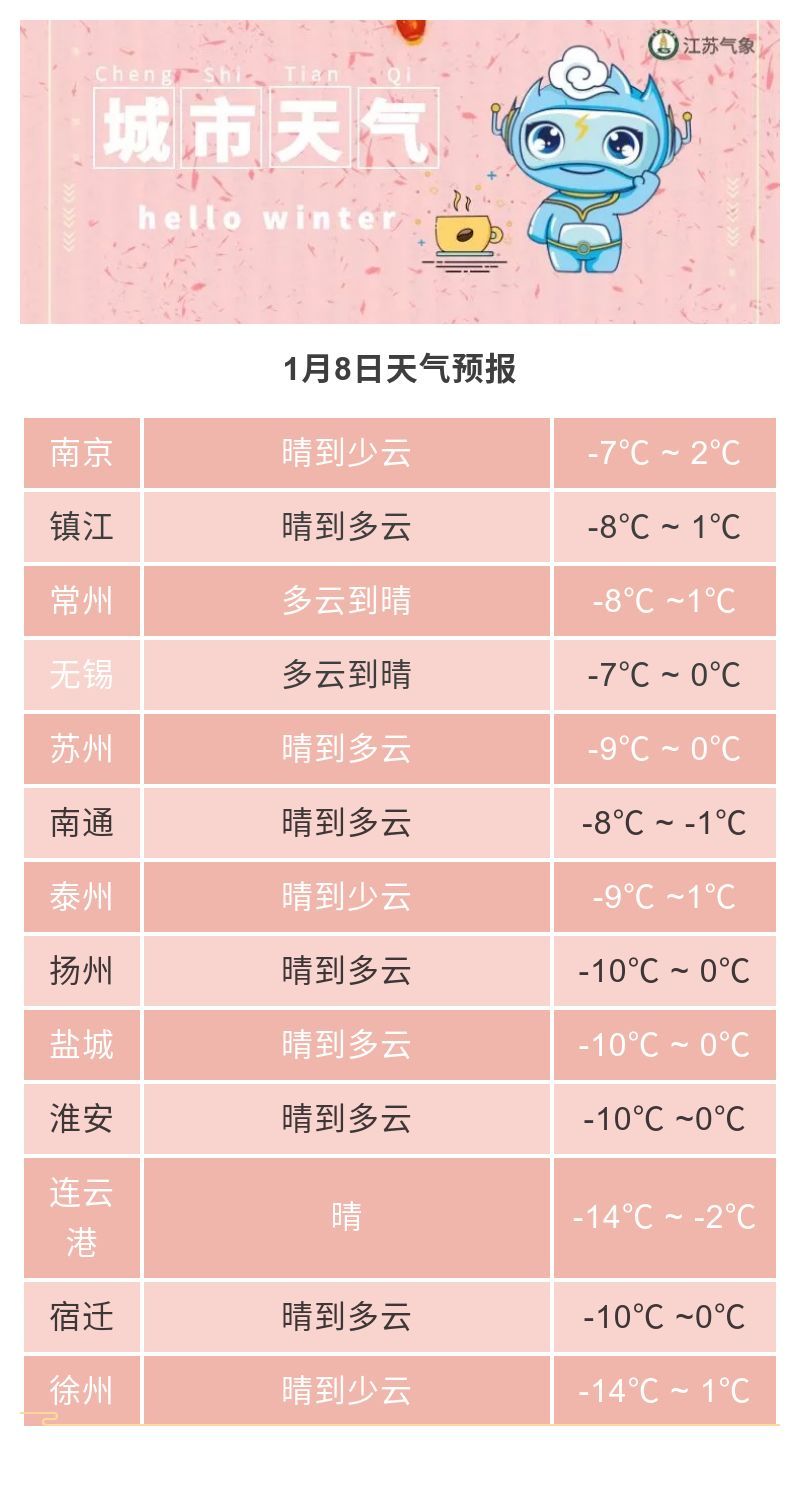 根据最新天气预报,8日最低温度较7日有少量回升,8日淮北最低温度为零下11到12℃,苏南地区零下8℃左右,其他地区零下9℃到10℃。8日全省晴到少云,最高气温0℃左右。而到了9日,全省温度将缓慢回升,最高温度能达到3到4℃,气温回升比较明显。到了10日,江淮之间北部和淮北地区零下7℃左右,其他地区零下4℃到5℃,全省大部分地区有冰冻,本次寒潮接近尾声。