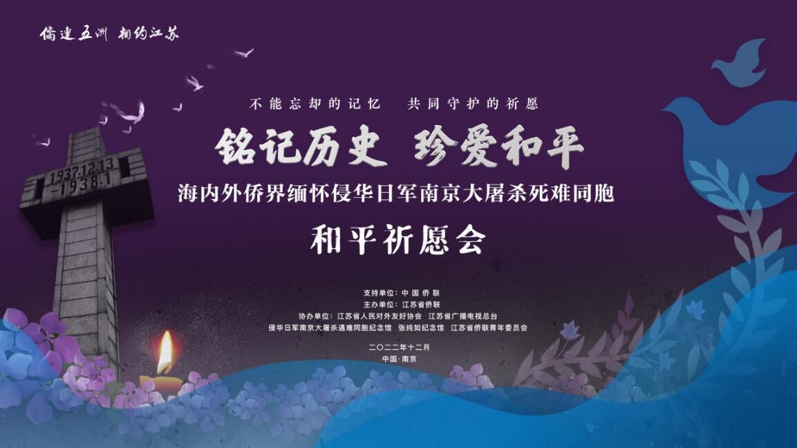 新江苏·中国江苏网讯(通讯员 何雯 记者 丁小玲)今年是南京大屠杀惨案发生85周年。为缅怀死难同胞、传播历史真相,展示侨胞“勿忘国耻、振兴中华”的责任担当,表达侨界“祈愿和平、圆梦中华”的共同心声,进一步汇聚侨胞爱国报国、共创伟业的精神力量,12月7日上午,“侨连五洲·相约江苏——铭记历史珍爱和平”海内外侨界缅怀侵华日军南京大屠杀死难同胞和平祈愿会在南京举办。