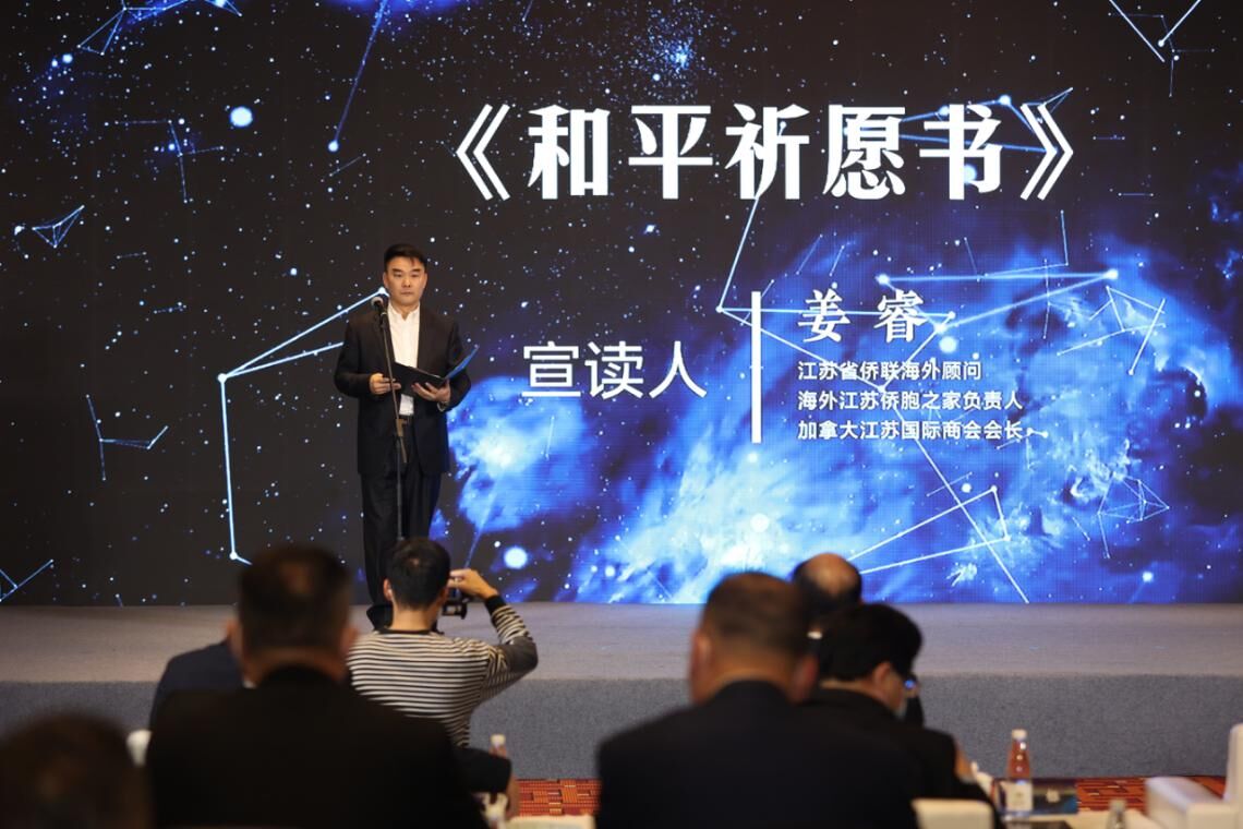 和平祈愿会上,江苏省侨联海外顾问、加拿大江苏国际商会会长姜睿先生作为海外江苏侨胞之家负责人代表,宣读了由35个国家的38家海外江苏侨胞之家共同发出的《和平祈愿书》。