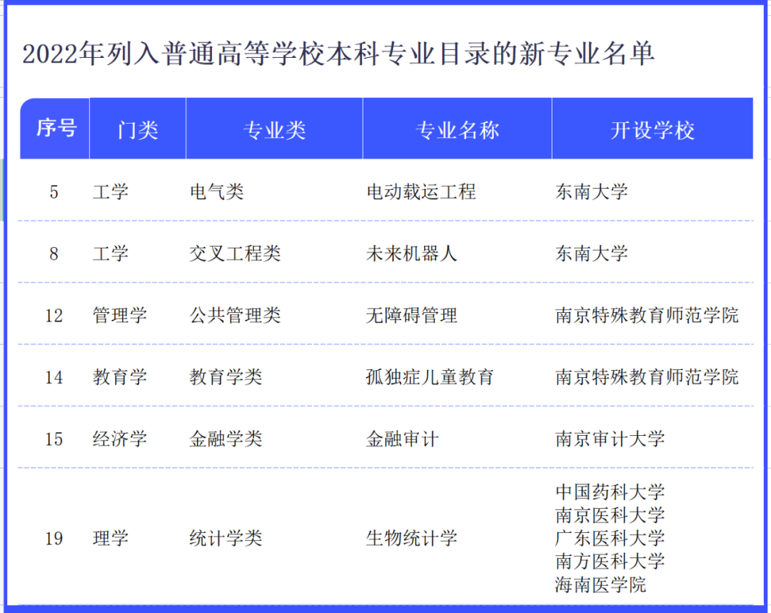 其中分布的新专业中江苏省新增的专业有电动载运工程、未来机器人、无障碍管理、孤独症儿童教育、金融审计、生物统计学共计六个专业。