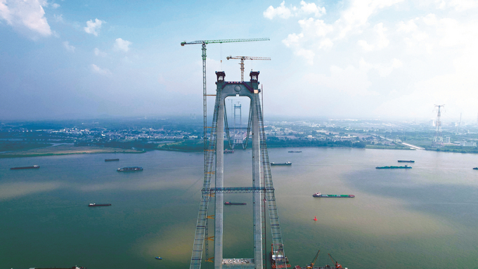 6月12日拍摄的龙潭长江大桥建设现场。(省交建局供图)