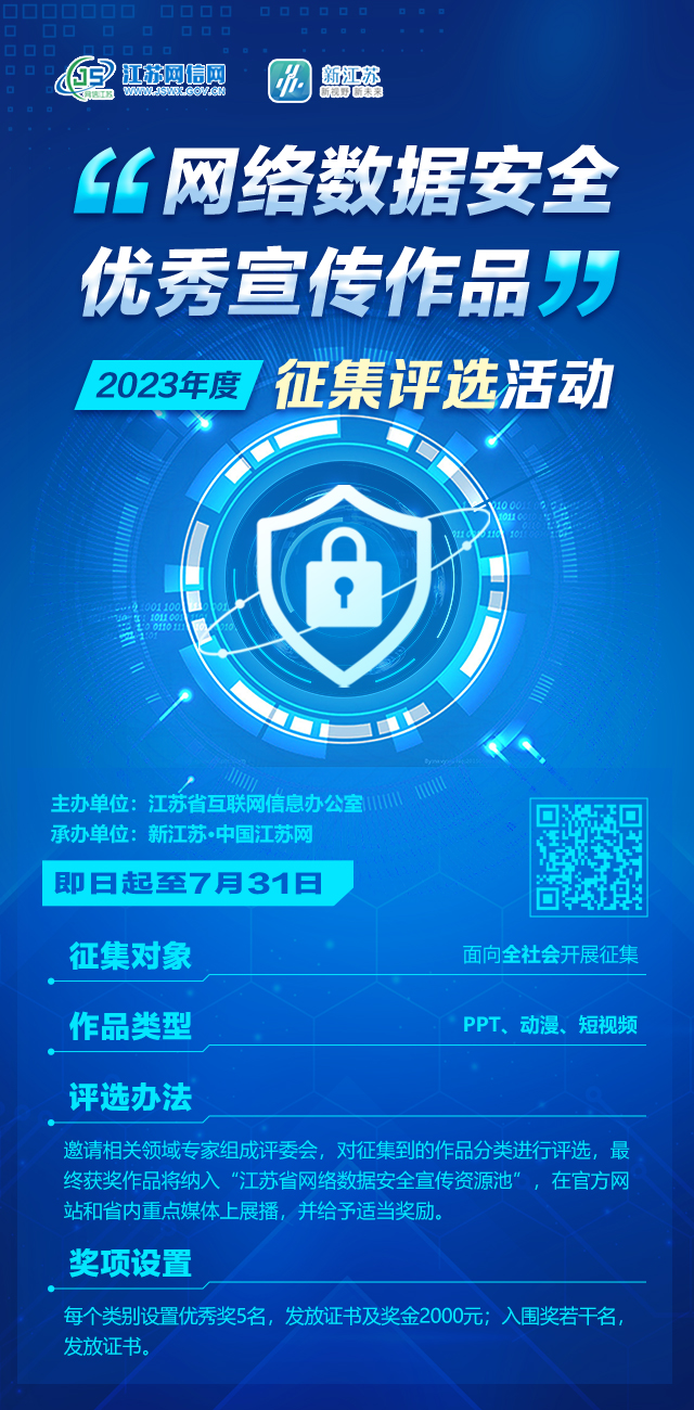 新江苏·中国江苏网讯(记者 徐春晖)为深入宣传贯彻《数据安全法》《个人信息保护法》等法律法规及政策规定,提高全社会数据安全和个人信息保护意识,即日起至7月31日,江苏省互联网信息办公室在全省范围内开展“网络数据安全优秀宣传作品”征集评选活动。