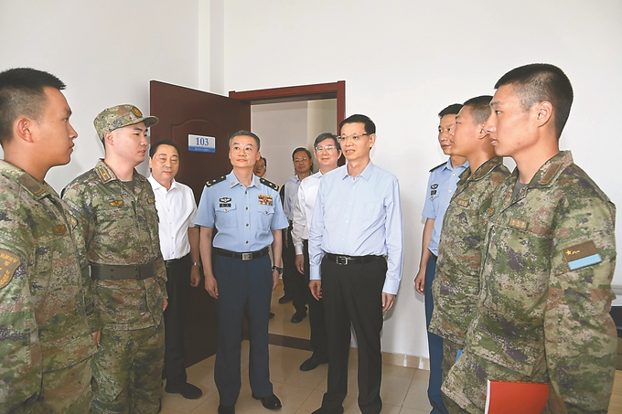空军某部始建于新中国成立初期,经历战火、抢险救灾等重大任务考验,形成了“一切为了前线、一切为了胜利”等优良传统。许昆林听介绍、看展陈,走进宿舍了解战士们战备训练和生活情况。许昆林说,江苏是具有军爱民、民拥军光荣传统的红色土地。驻苏部队坚定举旗铸魂、聚力练兵备战,把驻地当故乡、视人民为亲人,长期以来为全省经济健康发展、社会和谐稳定流血流汗、保驾护航。我们一定深入贯彻习近平强军思想,以纪念延安双拥运动80周年为契机,强化国防意识,加强统筹协调,以更实举措做好服务保障,以更大力度深化军民双拥共建,助力形成各司其职、紧密协作、规范有序的跨军地工作格局,不断巩固发展同呼吸、共命运、心连心的军政军民关系,努力为强国强军事业作出新贡献。