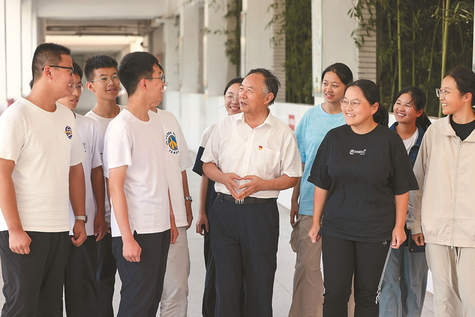 在第三十九个教师节到来之际,沭阳如东中学党委书记、校长周桂官被授予江苏“时代楷模”称号。图为九月五日,周桂官和学生们在一起。 记者 陈俨 摄