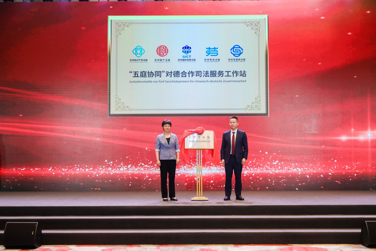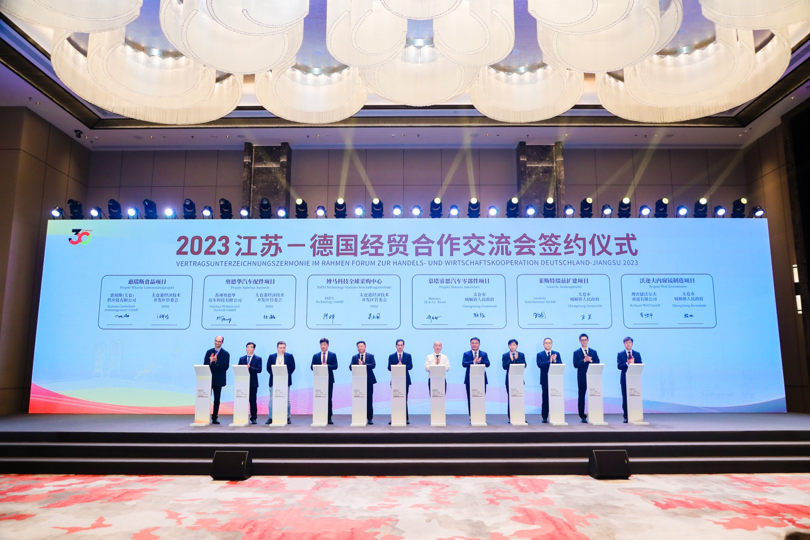 老朋友带来新合作,务实互作铺就互利共赢之路。当天,众多德国经贸机构和企业带着投资计划与合作展望到会交流,并于现场签约了22个项目,涉及工业制造、生物医药、新能源、绿色环保、文化艺术等多个领域。此外,GIZ中德(太仓)能效网络小组助力绿色发展成果发布,AHK学院、“五庭协同”对德合作司法服务工作站、公安SEE德企服务站、汉堡港与太仓港合作备忘录等合作也现场揭牌,这些经贸领域的深度牵手,意味着江苏与德国将在产业人才培养、知识产权保护、物流服务等方面形成全方位、多层次的双向互动。