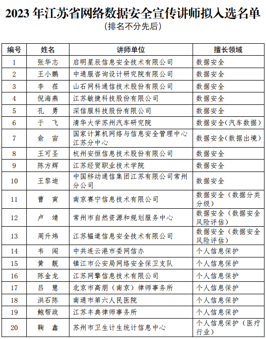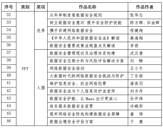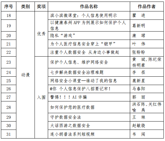 经单位和个人申报、初筛审查、专家评审和内容审核,评选出优秀作品15件、入围作品31件,遵选出宣传讲师20名。下一步,相关作品在江苏网信网“数据安全”栏目中发布,并纳入网络数据安全宣传资源池;优秀PPT类作品在后续宣贯活动中加以运用;入选宣传讲师推荐加入数据安全宣讲团。现将拟入选名单进行公示。
