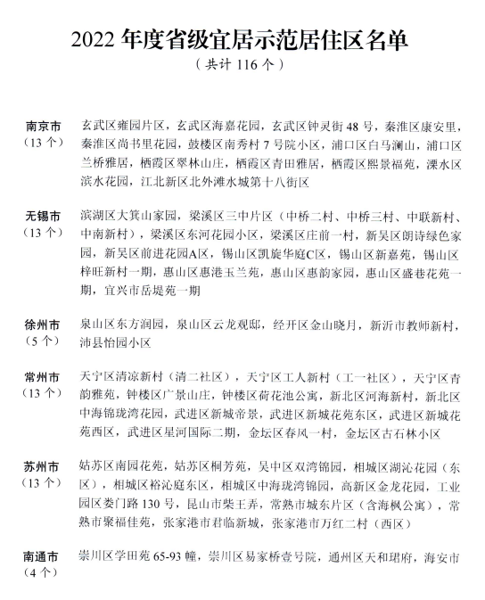 交汇点讯 美丽宜居住区是美丽江苏、美丽宜居城市建设的重要内容。记者从江苏省住建厅获悉,为切实改善居住条件和人居环境,江苏进一步加强美丽宜居住区建设。近日,2022年度省级宜居示范居住区名单出炉。经综合评定及评审结果公示,南京市玄武区雍园片区等116个项目上榜,被评定达到省级宜居示范居住区创建标准。