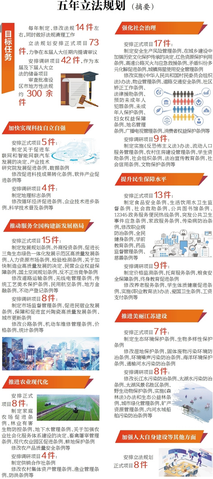 围绕这个工作目标,立法规划安排了115件立法项目。其中,正式项目73件,拟于任期内提请审议;调研项目42件,作为项目储备。全部项目中,新制定52件、废旧立新5件、修改58件,包括以下六个方面:在加快实现科技自立自强方面,安排制定关于促进车联网和智能网联汽车发展的决定、产业技术研究院发展促进条例、数据条例等5件正式项目、4件调研项目;推动服务全国构建新发展格局,安排修改发展规划条例、作出关于加快制造业高质量发展的决定、制定民营企业权益保障条例等15件正式项目、8件调研项目;在推进农业现代化方面,安排制定家庭农场促进条例、作出关于加强农业社会化服务体系建设的决定、修改农产品质量安全条例等8件正式项目、4件调研项目;在强化社会治理方面,安排制定、修改安全生产风险管理条例、物业管理条例、矛盾纠纷多元化解促进条例等17件正式项目、9件调研项目;在提升民生保障水平方面,安排制定食品安全条例、社会救助条例、12345政务服务便民热线条例等13件正式项目、9件调研项目;在推进美丽江苏建设方面,安排制定、修改生态环境保护条例、湿地保护条例、固体废物污染环境防治条例等7件正式项目、8件调研项目;此外,在加强人大自身建设等方面还安排立法规划正式项目8件。