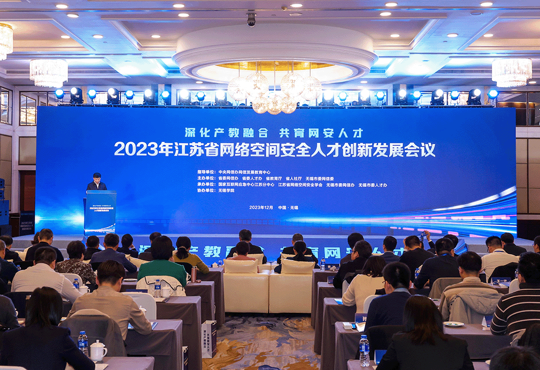 12月14日下午,2023年江苏省网络空间安全人才创新发展会议在无锡举办。本次会议以“深化产教融合 共育网安人才”为主题,着力深化网络安全领域产学研合作,推动网安人才创新发展。中央网信办网信发展教育中心相关负责人,省委网信办副主任刘伟,无锡市委常委、宣传部部长李秋峰出席并致辞。