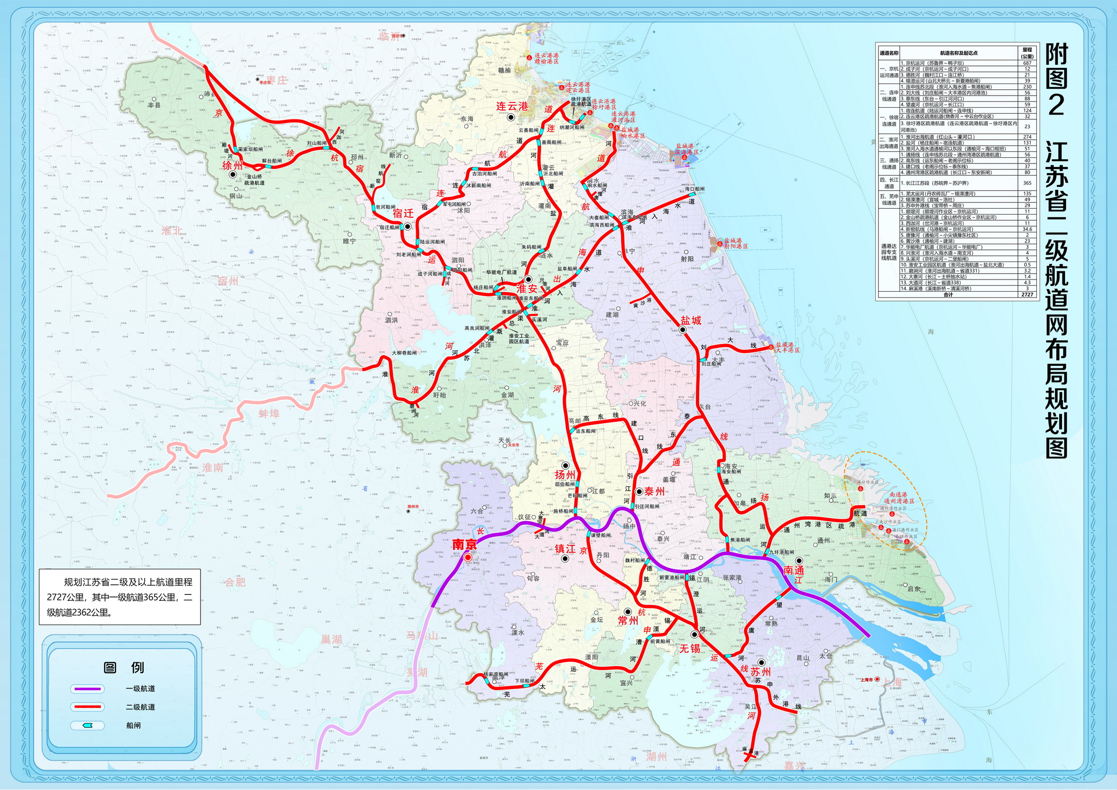 未来,江苏省规划形成“两纵五横”的干线航道网络,“两纵”由京杭运河通道、连申线通道组成,“五横”由徐宿连通道、淮河出海通道、通扬线通道、长江通道、芜申线通道组成,共计4192公里。其中一级航道365公里,二级航道2362公里,三级航道1465公里。二级航道应满足2000吨级船舶正常通行,三级航道应满足1000吨级船舶正常通行。