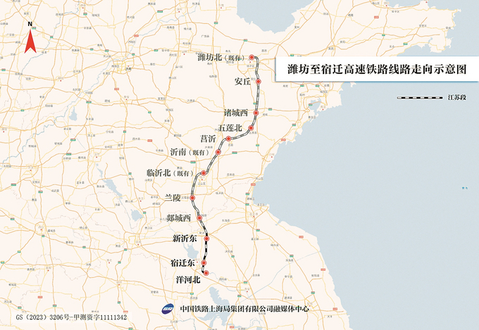 潍宿高铁是中长期铁路网规划中京沪辅助通道的组成部分,也是国家《“十四五”铁路发展规划》的建设项目。潍宿高铁经山东省日照市、临沂市,江苏省新沂市、宿迁市,设计时速350公里。全长约399公里,其中江苏段约74公里。初步设计批复总投资约717.3亿元,其中江苏段投资约143亿元。
