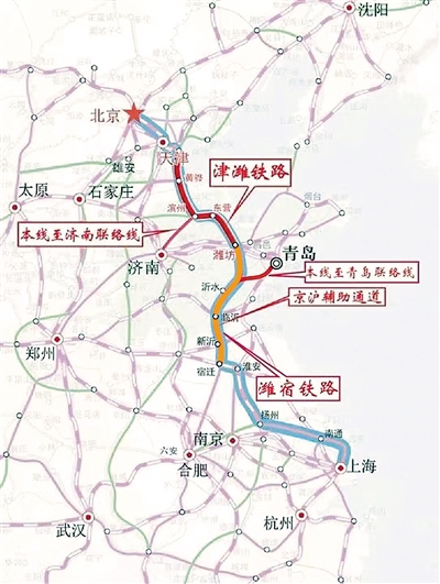华设设计集团综合规划研究院副院长裴剑平介绍,在规划中京沪通道包含两条路径,一是北京—天津—济南—南京—上海(杭州)高速铁路,也就是京沪高铁和宁杭高铁。另一条路径是北京—天津—东营—潍坊—临沂—淮安—扬州—南通—上海高速铁路,由京津城际、天津—潍坊铁路、潍宿高铁等项目共同组成,因此,这条路径又被称为京沪二通道。