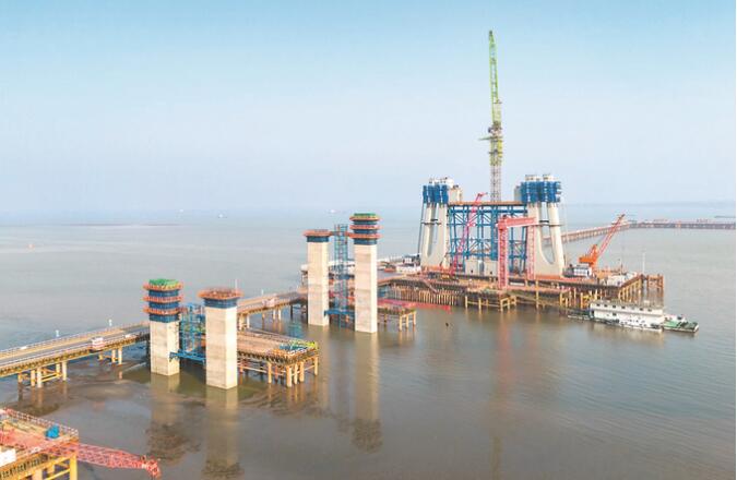 建设中的张靖皋长江大桥。 郎丛柳 王志昊 摄