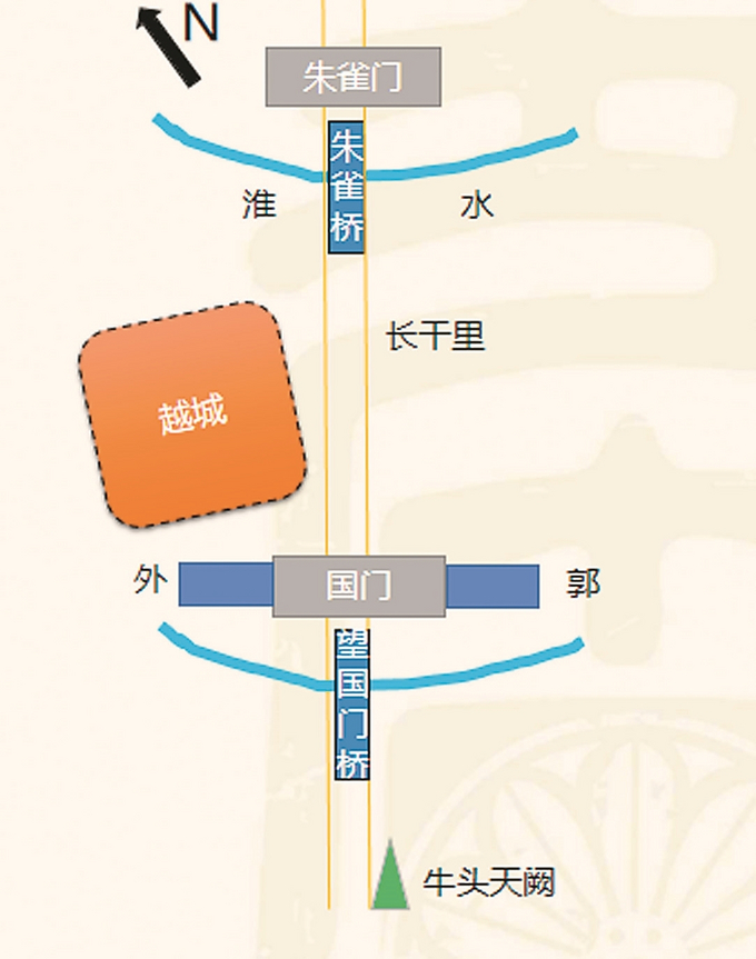 南朝时的宫城位于今大行宫附近,从宫城到长干里有一条笔直的御道,御道两边为官署建筑等。沿着御道,自宫城大司马门,经宣阳门,到朱雀门,南北长七里。经朱雀门南渡朱雀桥,南出即进入长干里。