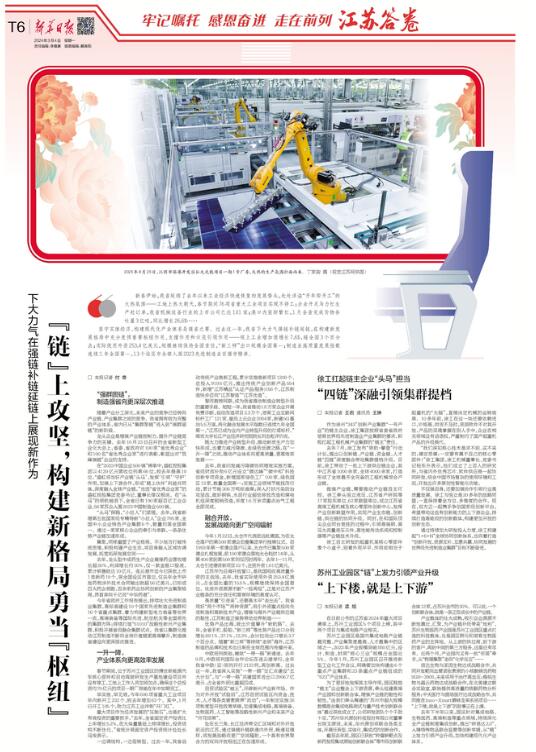去年7月,徐工发布“领航·攀登”行动计划,提出以创新链、产业链、资金链、人才链“四链”深度融合带动集群提档升级。目前,徐工带动了一批上下游供应链企业,其中江苏省1000余家、全球4000余家,打造形成了全球最齐全完备的工程机械综合产业链。