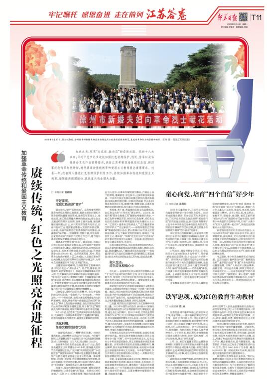 以庄重、敬仰的仪式缅怀先烈,从红色精神中汲取力量。2023年中国烈士纪念日,徐州数十对新婚夫妇来到淮海战役烈士纪念塔前缅怀先烈,厚植爱党、爱国、爱社会主义的情怀。自2015年起,江苏在全国率先举办“9·30”烈士纪念日新婚夫妇向革命烈士献花活动,如今越来越多的青年人加入到这一活动中,也点燃了江苏人崇尚英雄、敬仰先烈的爱国热情。以重要时节、重大活动为牵引,全省各红色场馆精心组织开展隆重热烈、仪式感强的纪念活动,激发青年群体发扬红色传统、传承红色基因的青春风采。