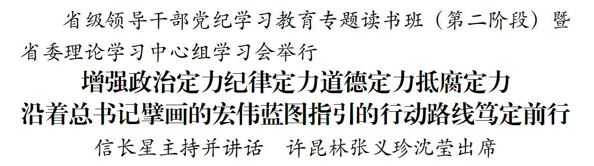 新华报业·新江苏讯 按照党中央部署和省委工作安排,5月22日至23日,省级领导干部党纪学习教育专题读书班(第二阶段)暨省委理论学习中心组学习会举行。省委书记信长星主持并讲话。省长许昆林、省政协主席张义珍、省委副书记沈莹出席。