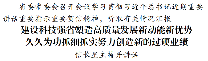会议强调,在全国科技大会国家科学技术奖励大会两院院士大会上,习近平总书记就科技事业发展提出一系列新观点新论断新要求,为做好新时代科技工作指明了前进方向。要深入学习领会,准确把握近年来我国科技创新发展取得的历史性成就、新时代科技事业发展的重要经验、新形势下加快建设科技强国的基本内涵和主要任务,高水平建设科技强省,着力打造具有全球影响力的产业科技创新中心,塑造江苏高质量发展的新动能、新优势。