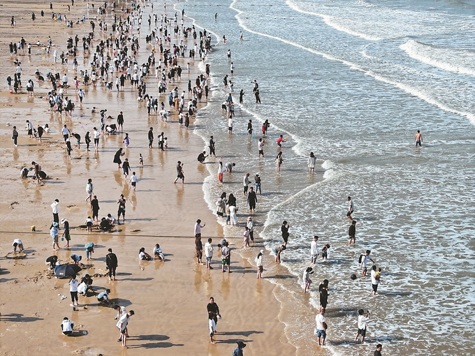 10月1日,游客在连云港连岛景区大沙湾海滨浴场观景踏浪。王春 摄 (视觉江苏网供图)