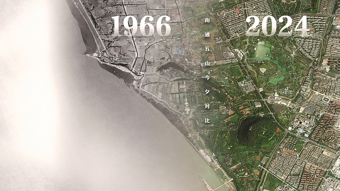 卫星图像中的南通五山地区滨江片区今昔对比。