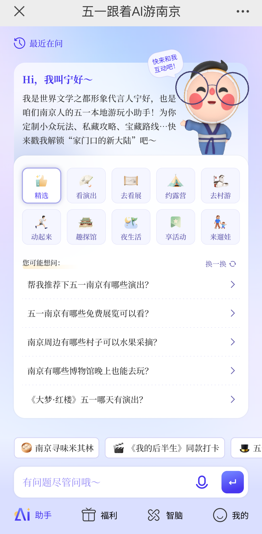 其中,“AI南京”深耕城市文化肌理,通过智慧算法解锁本地深度文旅体验,只需在“AI南京”输入自然语言需求,如“带娃出行”“想看沉浸式演出”等简单指令,市民就可获得出行前的智能规划、实时活动推荐及消费福利整合等服务,持续打造“可感知、可交互、可传播”的城市文化新体验。