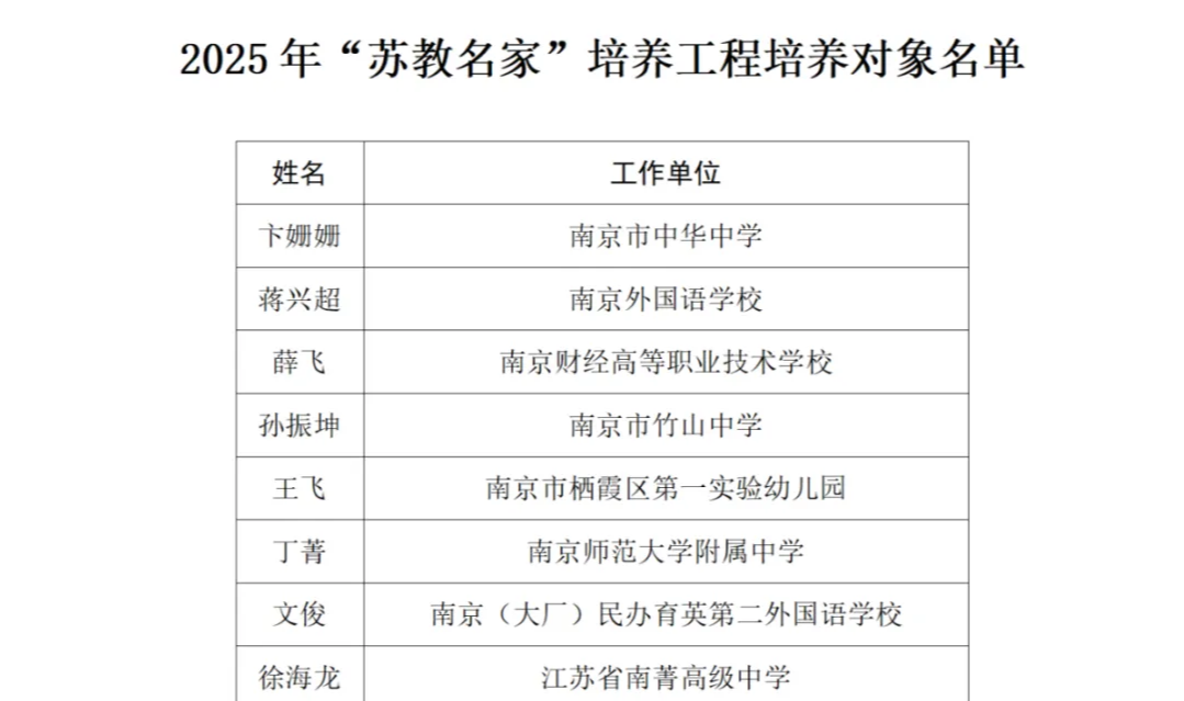 近日,江苏省教育厅公布了2025年“苏教名家”培养对象名单,南京市中华中学教师卞姗姗等全省共50名教师入选。