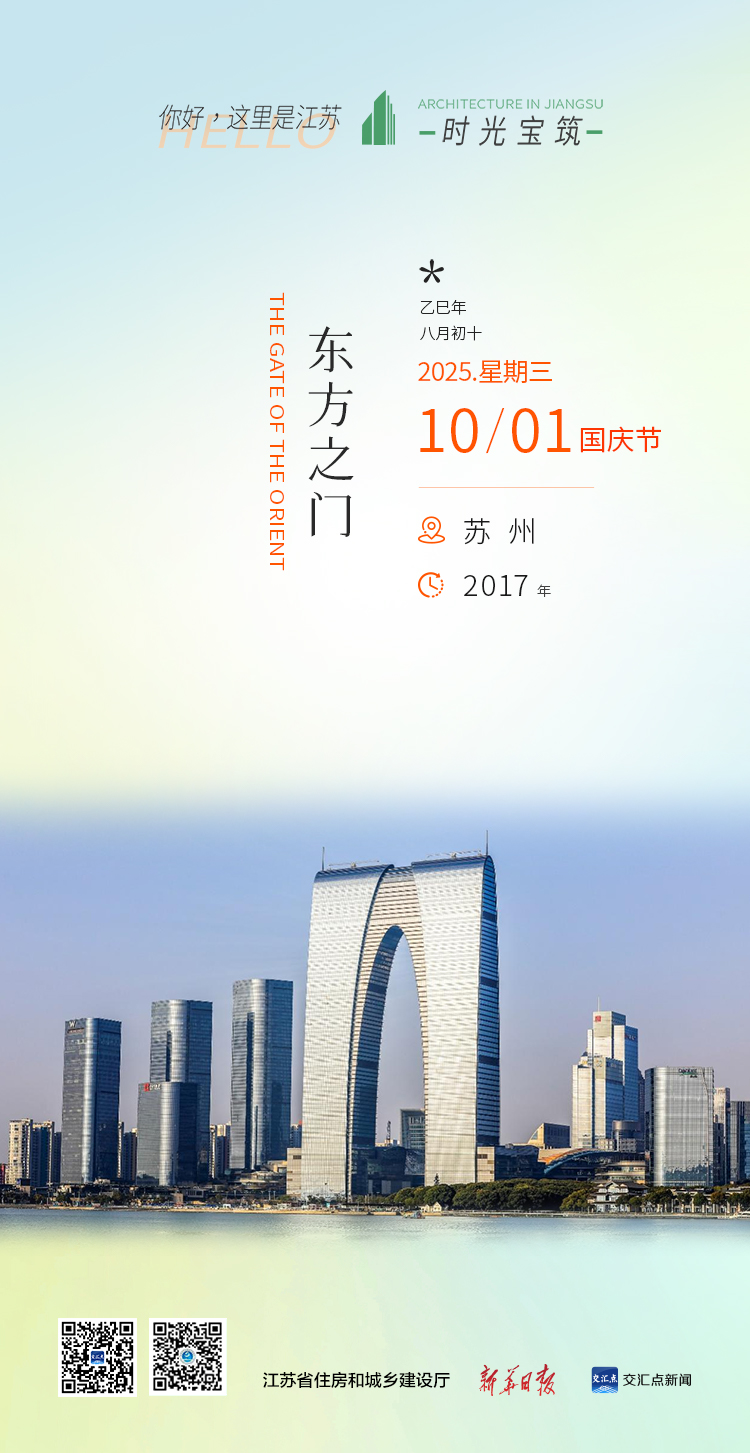 该建筑的设计灵感来自苏州水陆城门,通过门洞造型将CBD轴线引向金鸡湖,实现视觉上的延伸。