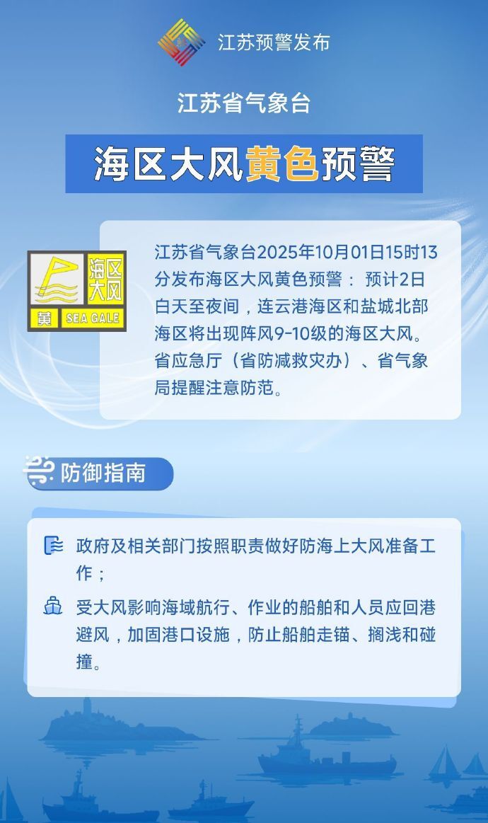 江苏省气象台2025年10月01日15时13分发布海区大风黄色预警:预计2日白天至夜间,连云港海区和盐城北部海区将出现阵风9-10级的海区大风。省应急厅(省防减救灾办)、省气象局提醒注意防范。