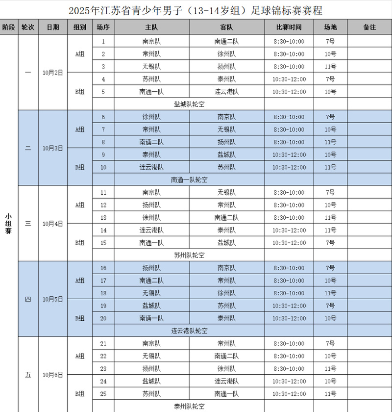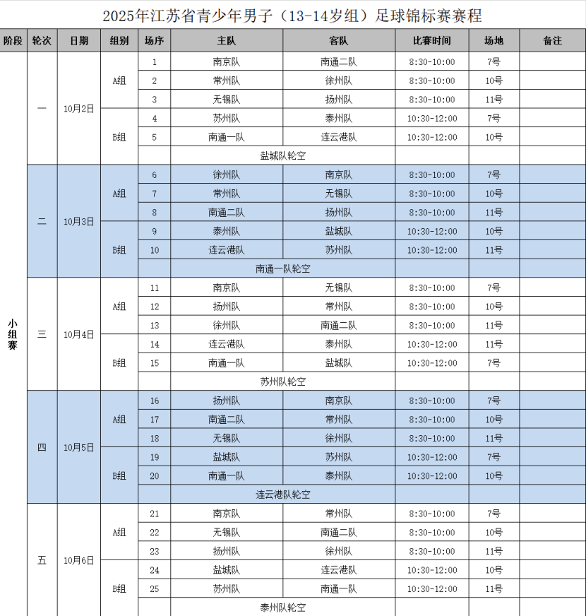 江苏省青少年男子(13—14岁组)足球锦标赛由省体育局和省教育厅共同主办,江苏体彩公益支持。参赛的11支球队由各市组队,其中青训基础比较深厚的南通组织了两支球队,其他参与的9市都是派出了1支队伍。13—14岁组的男子比赛将于10月8日结束,女子组比赛将于10月13日接续打响。